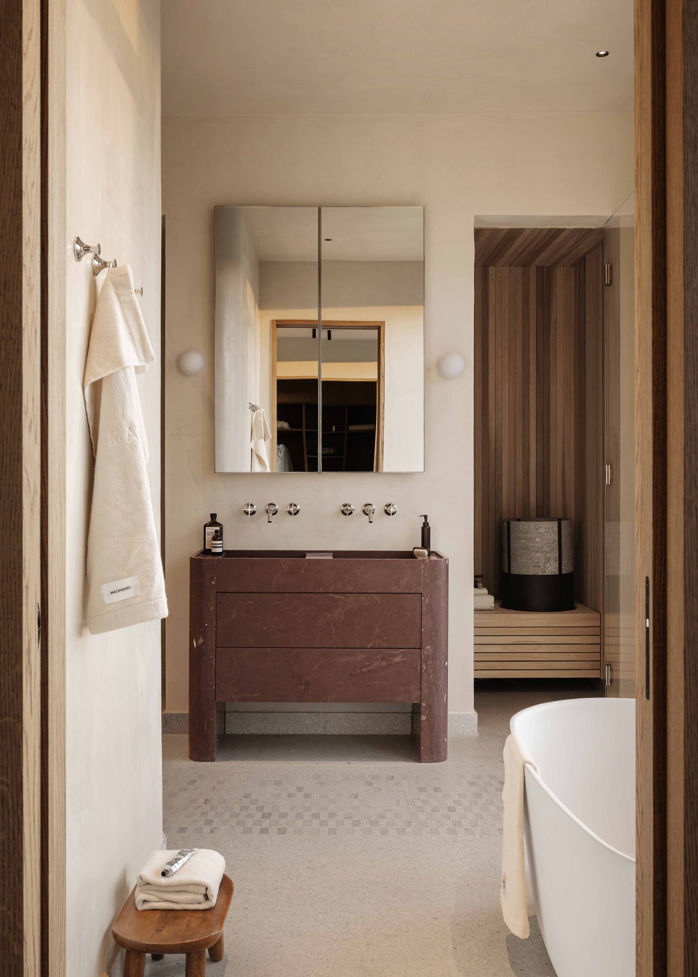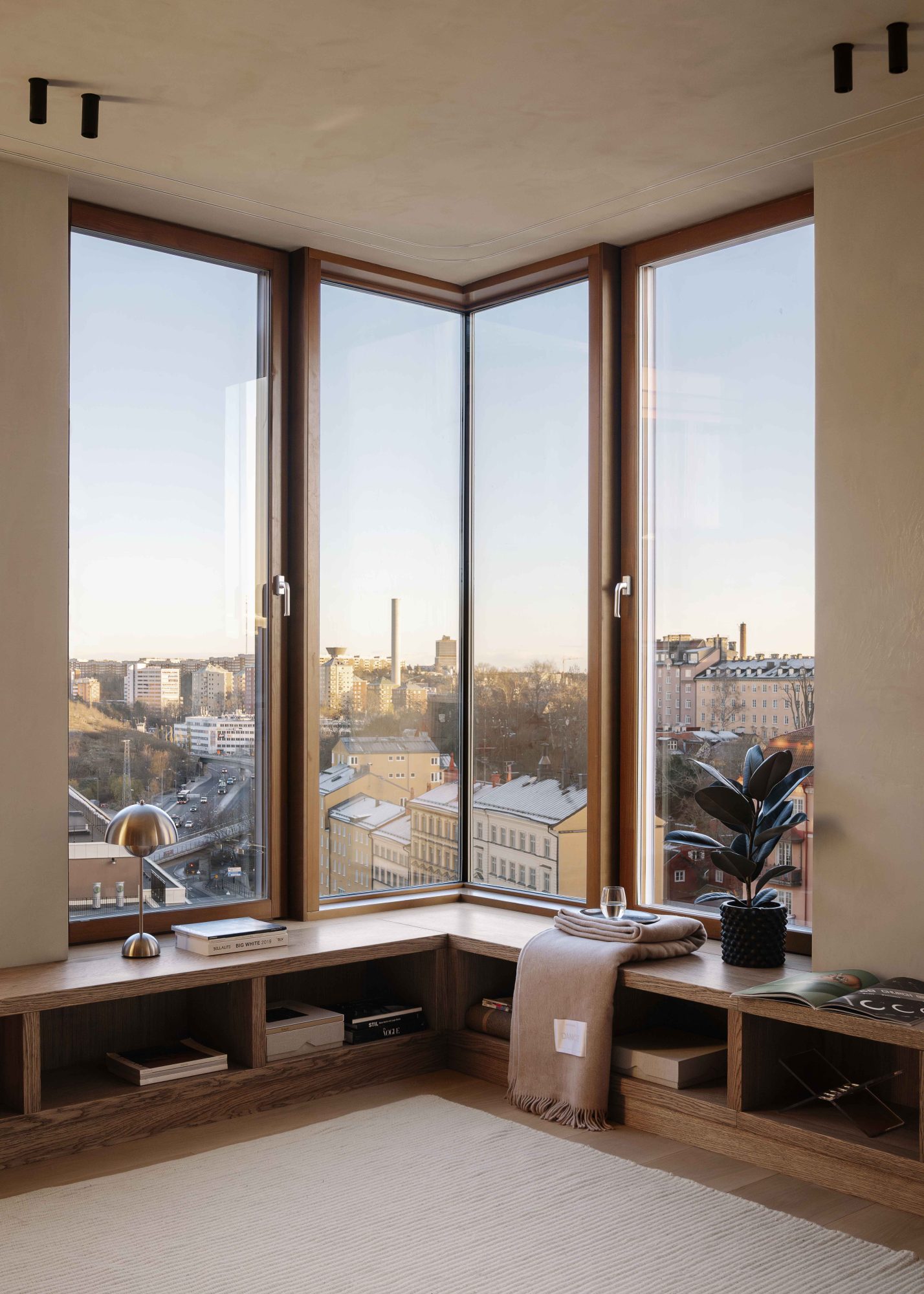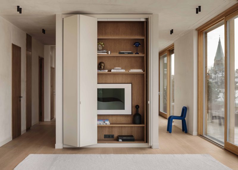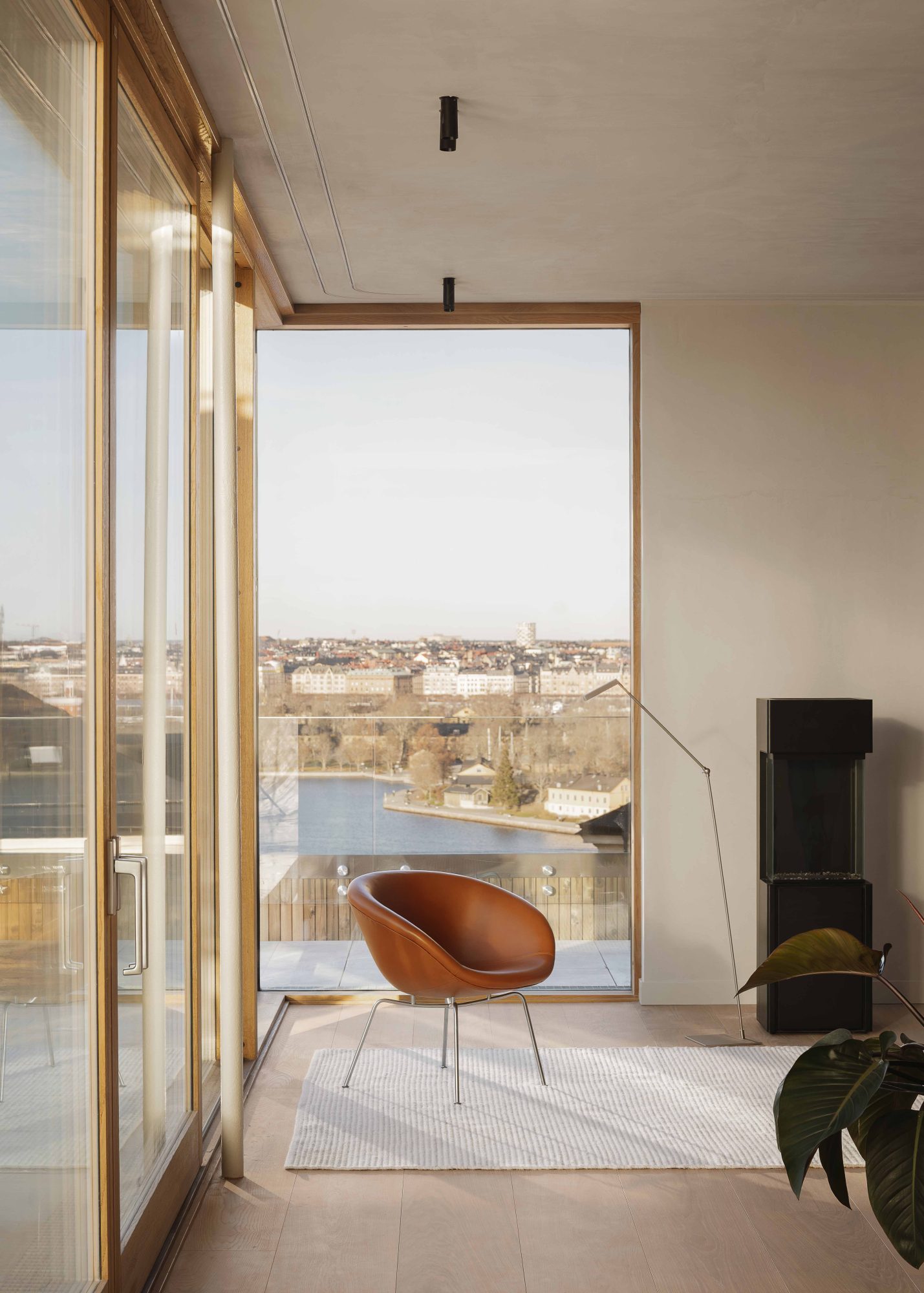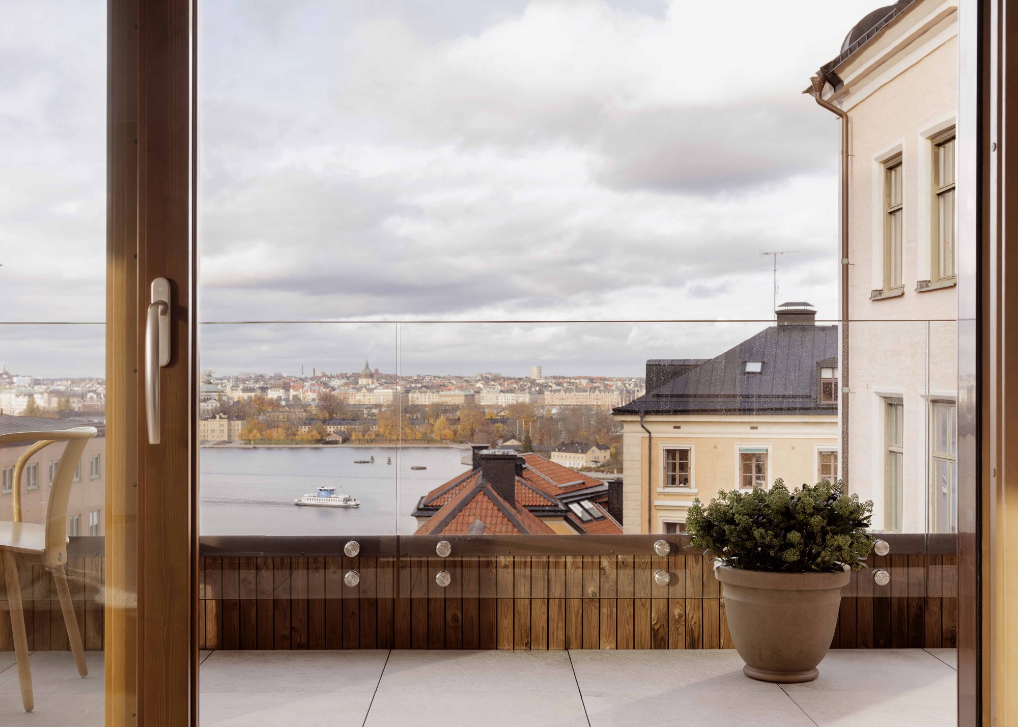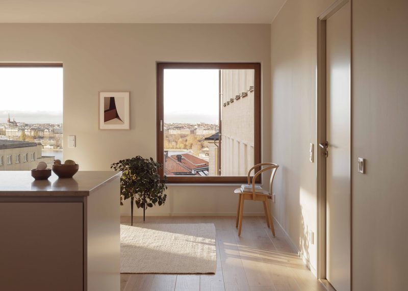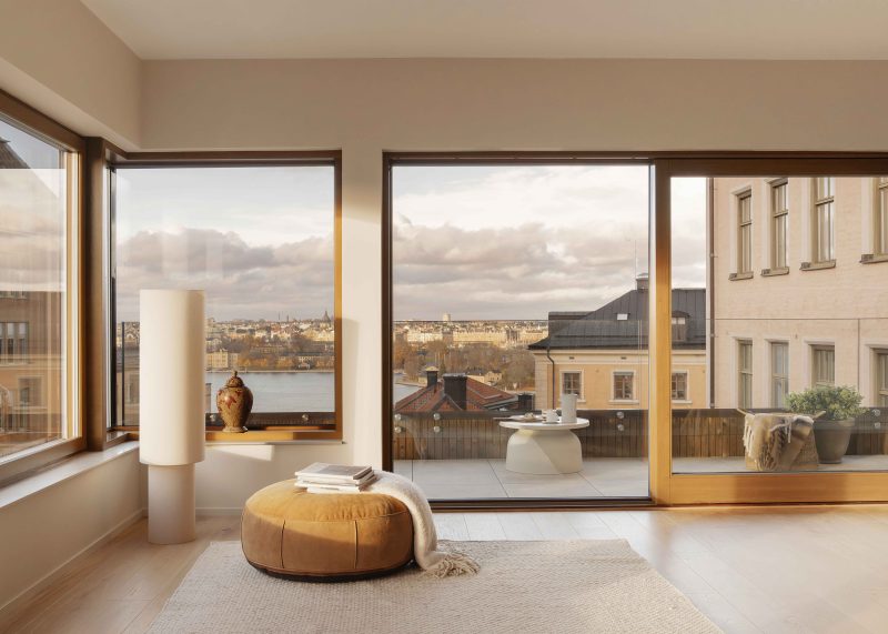 Högst upp i huset återfinns en takvåning om 190 kvm med en privat terrass på 150 kvm som erbjuder utsikt över både Saltsjön och staden.
